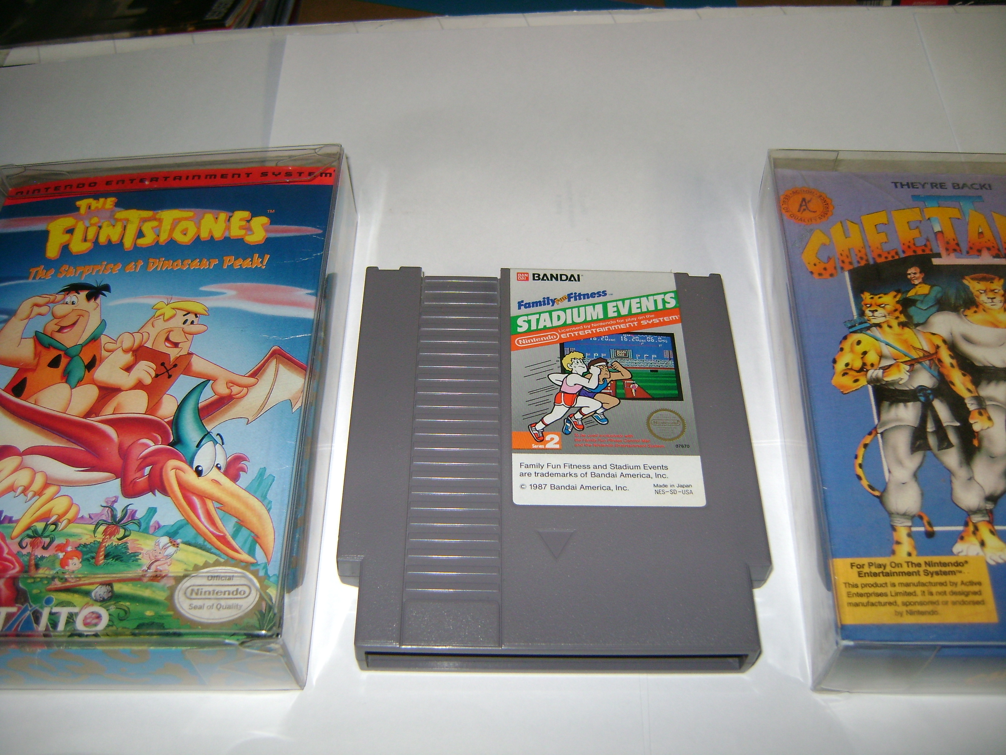 Left: The Cheetahmen II (NES), a never-released sequel to the original. Only 1500 copies were printed. Although the game has more bugs than pixels, cartridges fetch upwards of $600. Center: Stadium Events is one of the rarest cartridges for the NES. Complete-in-box (CIB) copies have sold for over $100,000. Right: The Flintstones: Surprise at Dinosaur Peak (NES). According to rumors, it was released as a rental-only title for Blockbuster Video’s chain of stores. Copies go for more than $600.