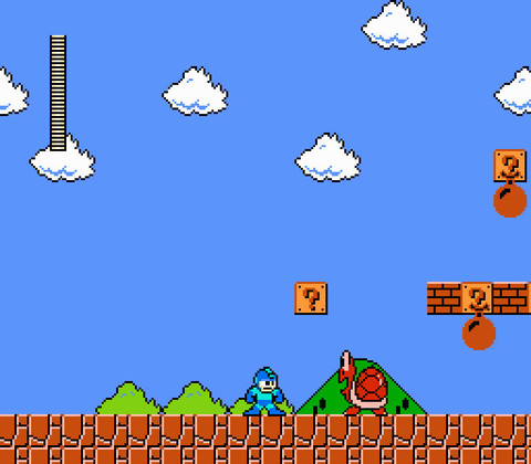 Mega Man Ultra, a ROM hack of Mega Man 2 by infidelity, reskins its original game and stirs in assets from other games. Here, Mega Man explores Dr. Wily’s temple, which uses a temple backdrop from Zelda II: The Adventure of Link.